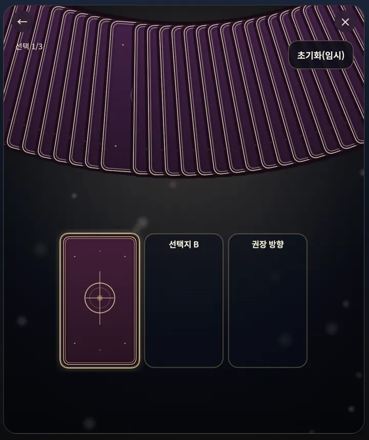 낭만타로의 card_select 화면은 이 기준을 가장 잘 보여 준다. 이 제품의 핵심은 결과 문구보다, 카드를 고르는 순간이 실제 리추얼처럼 느껴지는가에 있었다.