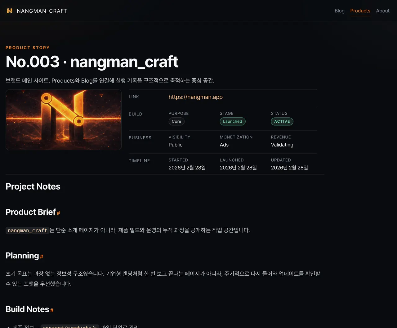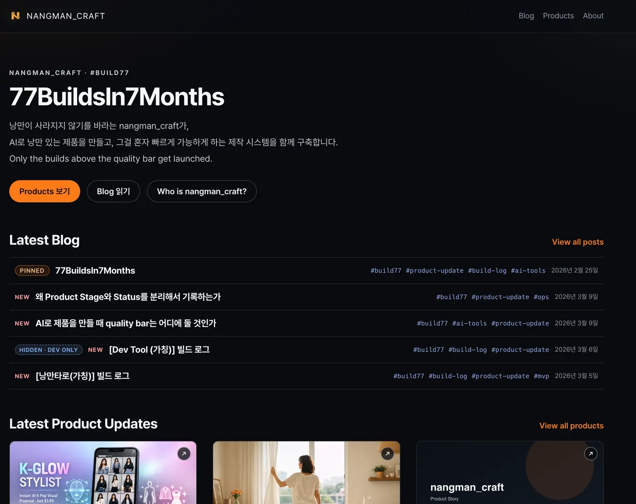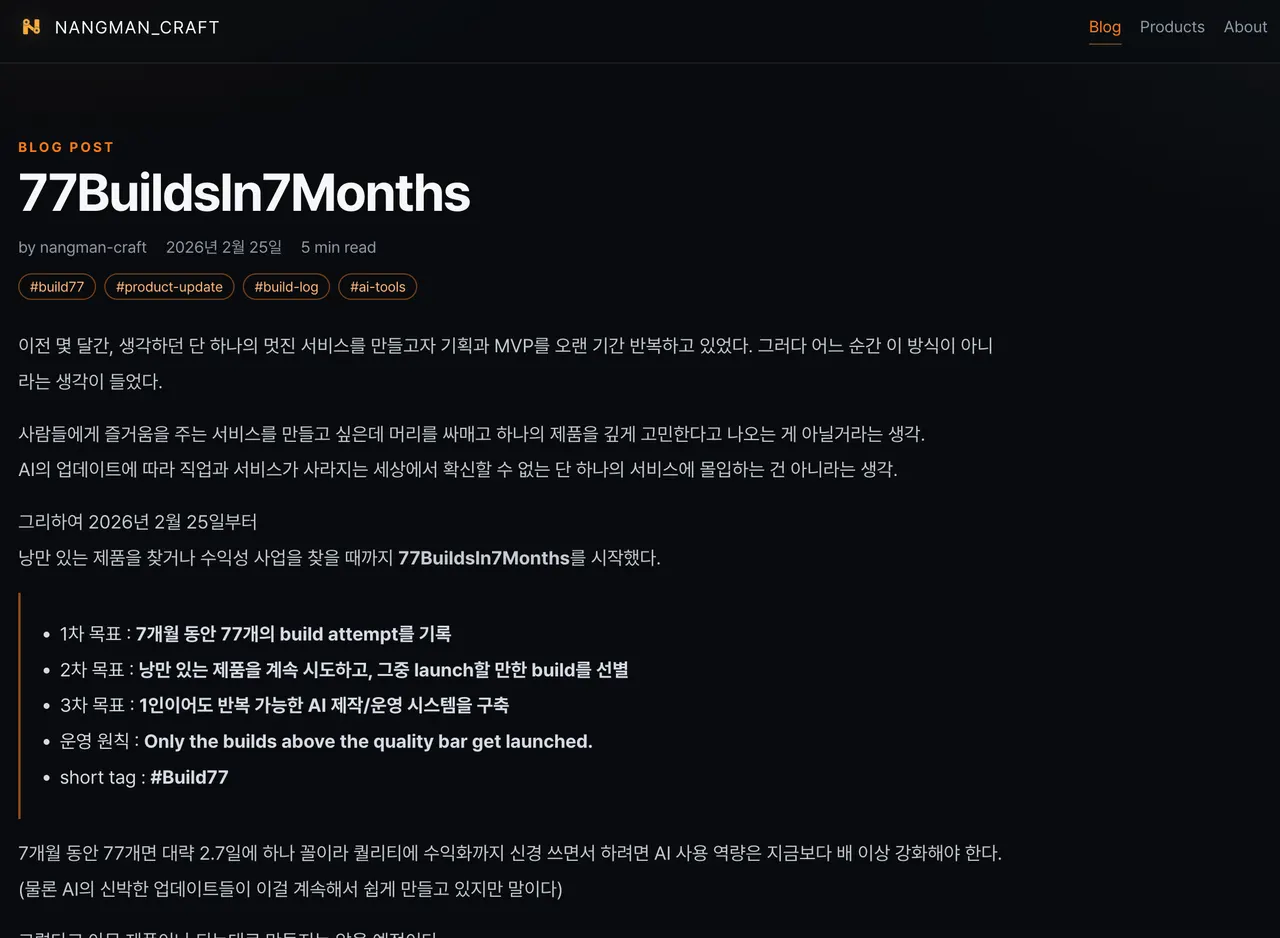 nangman_craft는 단순한 브랜드 소개 페이지가 아니라, 77BuildsIn7Months의 제품과 기록, 운영 판단을 함께 축적하는 중심 공간입니다.