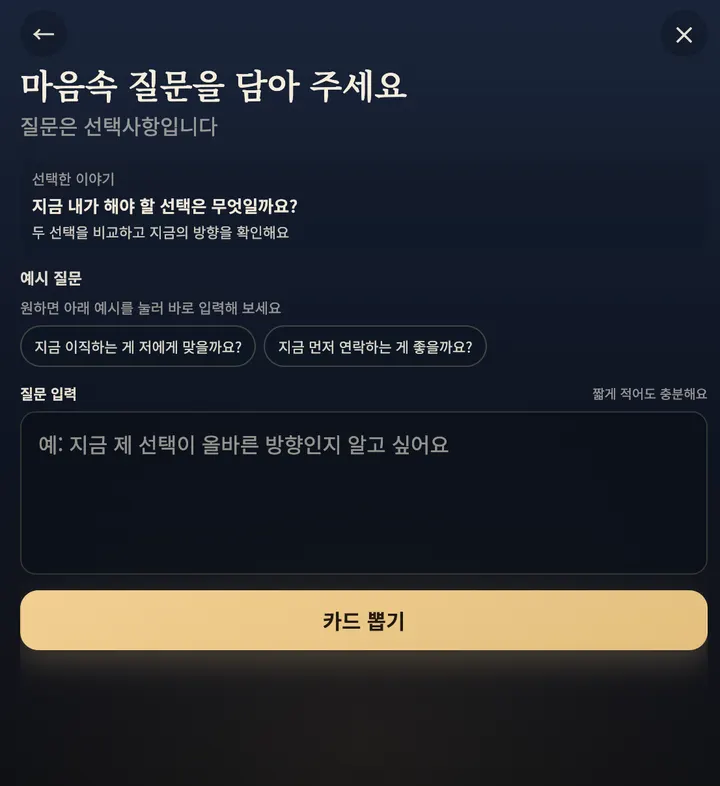 카드를 직접 고르는 순간이 실제 타로를 하는 듯 느껴져야 이 제품의 정체성이 살아난다고 봤고, MVP 단계에서 가장 많은 신경을 쓴 부분도 이 인터랙션이었습니다.