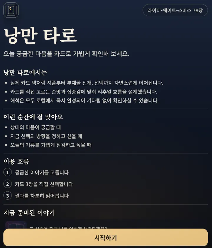 낭만타로(가칭)는 모바일에서 바로 시작할 수 있는 3카드 타로 리딩 서비스입니다.